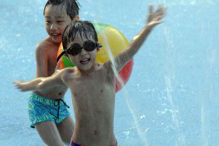 3日下午,臺北市最高溫達到攝氏38.6度,創(chuàng)今年入夏以來最高溫。自來水園區(qū)游泳池民眾帶小孩來戲水降溫。圖片來源:“中央社” 施宗暉 攝