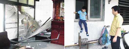 林基全說,昨天凌晨兩點(diǎn)“碰”一聲,他下樓查看,一樓鐵門和落地窗被撞毀,門已經(jīng)打不開,須爬窗子出去,“一看傻眼,散落一地的水泥有一、二百包”。