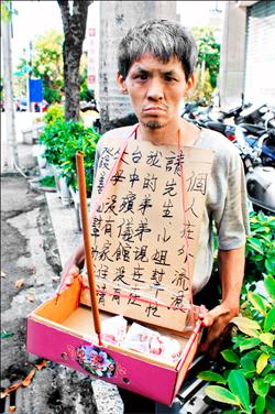 記者于今年4月間,就曾目睹他在臺(tái)中市一火車站旁行乞,不過,他坦言“業(yè)績”很差,每天僅乞得數(shù)十元,最差僅有1元。
