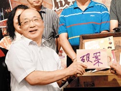 天助我也“破案了!”臺中市長胡志強昨天參加促銷觀光活動,伸手進百寶箱撿寶時,竟然從上百張紙牌,抽到“破案”牌,大家直呼“太巧了”、“難道是天意”!連他都笑得合不攏嘴。(圖片來源:臺灣《中國時報》)