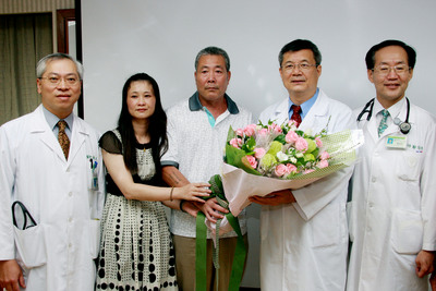 福建泉州男子施純炳(中)因罹患心臟疾病,在臺南奇美醫院進行手術,成為臺南地區首例赴臺就醫的大陸人士。2日他與女兒(左2)一起向主治醫師致謝。圖片來源:臺灣“中央社”