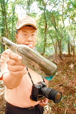 昨日踏查過程中,在壕溝內撿到一只玻璃酒瓶,樹根已長進瓶內,近瓶底處瓶身刻有“日本麥酒礦泉株式會社”文字。文史工作者程士毅表示,以此推敲,日軍當年規劃補給設施準備長期抗戰,從工事面積及規模、指揮所推測,戰壕約可容納一個加強營約500名軍士官。