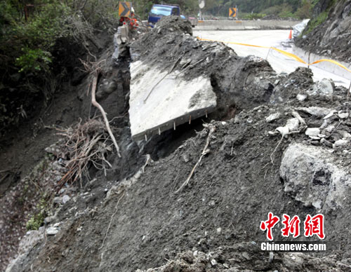 10月25日,在發(fā)現(xiàn)人體殘肢的蘇花公路112.8公里處,21日因臺風(fēng)和豪雨被泥石流沖垮的公路上,仍可看見被泥石流撕裂的水泥板懸掛在路邊,可見當(dāng)時泥石流威力之大。記者陳立宇 攝