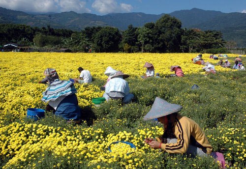 臺東杭菊進(jìn)入了采收期,但2010年因氣候變遷和部分蟲害影響,杭菊收成量減少3成。圖為農(nóng)民25日忙著采收杭菊,田園景色美不勝收。 圖片來源:“中央社”