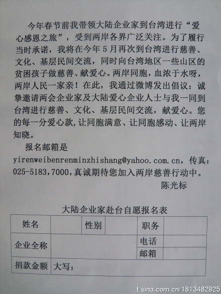 最后,陳光標提供了供企業家報名的郵箱和傳真,并另附一張報名表格式。他表示真誠期待企業家加入兩岸慈善行動中。(中國臺灣網 馮存健)