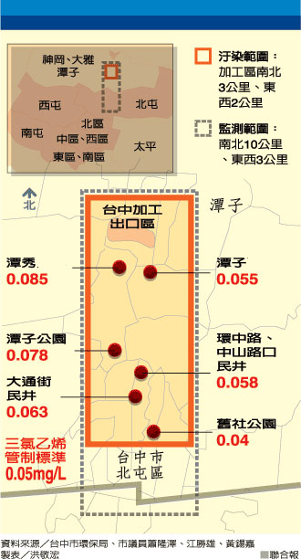 但臺中市環保局前年底接獲潭子“臺中新城”小區民眾陳情,指小區管理委員會定期送驗簡易自來水(即抽取地下水再處理),竟驗出有三氯乙烯,大家驚恐萬分,要求環保局重視。