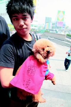來自桃園的高中生“小謝”帶著他的貴賓狗一起來參加游行,他特地為狗兒做了一件超人披風(fēng),上頭寫著“反霸凌”。圖片來源:臺(tái)灣《聯(lián)合報(bào)》