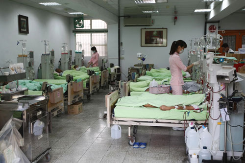 培德醫院13日開放媒體拍攝采訪,讓社會了解醫院的設備狀況。圖為醫護人員為受刑人在血液透析室洗腎。 圖片來源:“中央社”