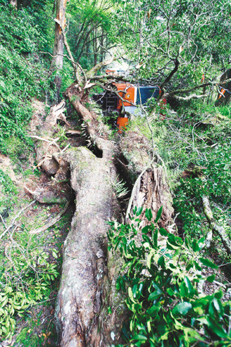 阿里山小火車翻覆意外,經(jīng)現(xiàn)場勘查懷疑森氏櫟是白蟻與真菌蛀食枝干,導(dǎo)致枝干斷裂擊中小火車。圖片來源:臺灣《聯(lián)合報》