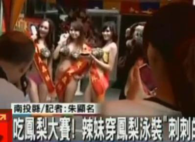 據報道,南投縣一鳳梨酥業者要促銷鳳梨酥,請來辣妹穿上菠蘿泳裝走秀,還舉辦吃菠蘿大賽,比比看誰能在最短時間內吃完整顆菠蘿;而3位菠蘿公主則把菠蘿果肉挖空之后當胸罩,并招呼民眾舔食。現場“升級”不少,不少路人前來圍觀拍照,“目不轉睛”,并踴躍“嘗試”。