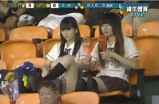 在9日的球賽轉播中,攝影師一如往常搜尋觀眾席上的正妹(美女)球迷,這時鏡頭對準2名學生妹,不過學生妹似乎不曉得自己入鏡了,其中一名學生妹起身想要順順裙子,坐下的同時跨腿翹腳,沒想到竟意外曝光,這“春光外泄”的瞬間全程被鏡頭直擊。