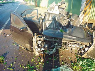 云林縣林內鄉外環道9日清晨發生自撞路樹四死重大車禍,肇事轎車扭曲變形全毀。圖片來源:臺灣《聯合報》