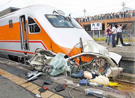 臺灣男子黃富國駕車闖公路與鐵路交叉道,被自強號火車撞上推擠到內壢火車站,慘死車內。圖片來自臺媒