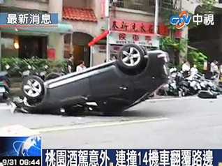桃園酒駕意外,轎車連撞14摩托車后翻覆路邊。圖片來自臺灣今日新聞網
