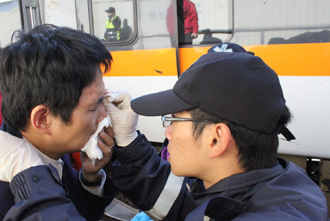 出事的太魯閣號列車的列車長(左)的頭部受傷,堅持留在現場未就醫,桃園縣政府消防局救護員現場為他上藥。(圖片來自臺灣媒體)