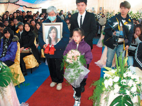 “我們答應(yīng)要參加家榛婚禮的,但沒想到是這樣的婚禮…”莊家榛的同學(xué)哭紅了眼,喜幛變挽聯(lián),結(jié)婚進行曲變哀樂,紅包變白包,禮堂變靈堂,走紅地毯卻不見新娘,真是情何以堪!