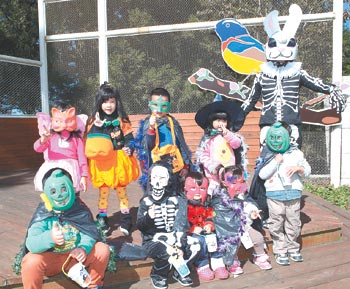 嘉義縣香林小學(xué)昨天慶祝萬圣節(jié),全校師生變裝上街發(fā)送糖果,四年甲班老師汪怡娉(右一)更精心裝扮成骷髏兔,帶小朋友游街。 圖片來源:《聯(lián)合報》