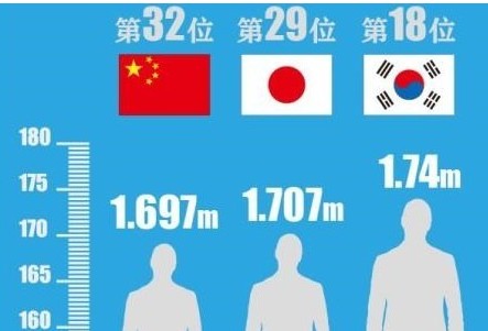 —近幾年世界男性平均身高排名中,韓國排第18位,平均身高1.74米;日本排29位,平均身高1.707米;中國男性排名32位,1.697米。 7歲到17歲的中國男孩平均身高比日本同齡男孩矮2.54厘米。