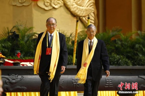 4月2日上午,中國國民黨中評委主席團主席徐立德(前)為黃帝敬獻頭炷香