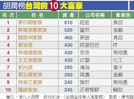據胡潤統計,這次富豪榜排名的上榜資產門檻為20億元,其中在臺灣出生成長的華人富豪有89位,其中78位住在臺灣,包括58歲的首富蔡衍明;9位住在大陸,如魏應州家族,其頂益旗下包括康師傅在內的大部分業務在大陸。
