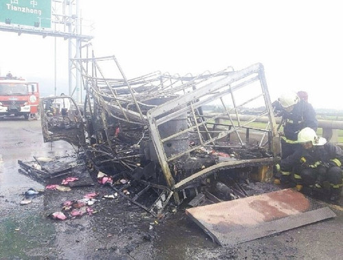 臺灣一運送冥紙貨車突然起火半小時燒成只剩骨架