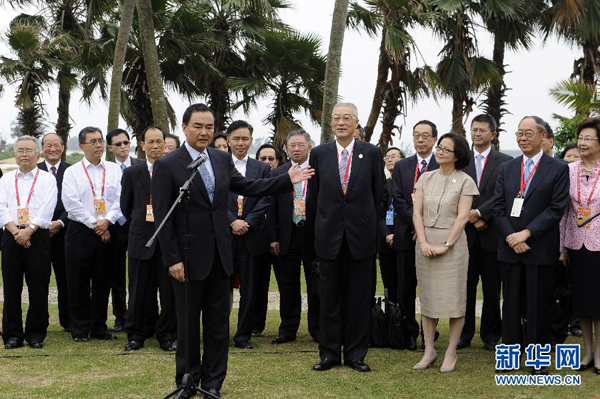 4月1日,中共中央臺辦、國務院臺辦主任王毅在海南博鰲舉行招待酒會,歡迎前來出席博鰲亞洲論壇的臺灣兩岸共同市場基金會名譽團長吳敦義一行。新華社記者金良快攝