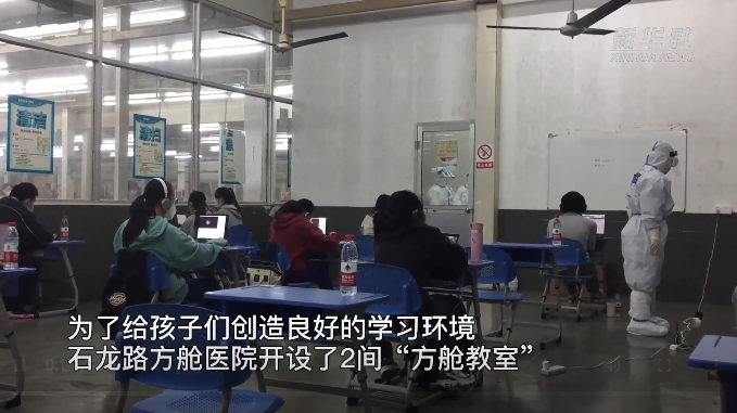 為了給孩子們創造良好的學習環境,石龍路方艙醫院開設了2間“方艙教室”。在教室里,孩子們用自己的電子設備,在線認真傾聽老師授課并按時完成課后作業。