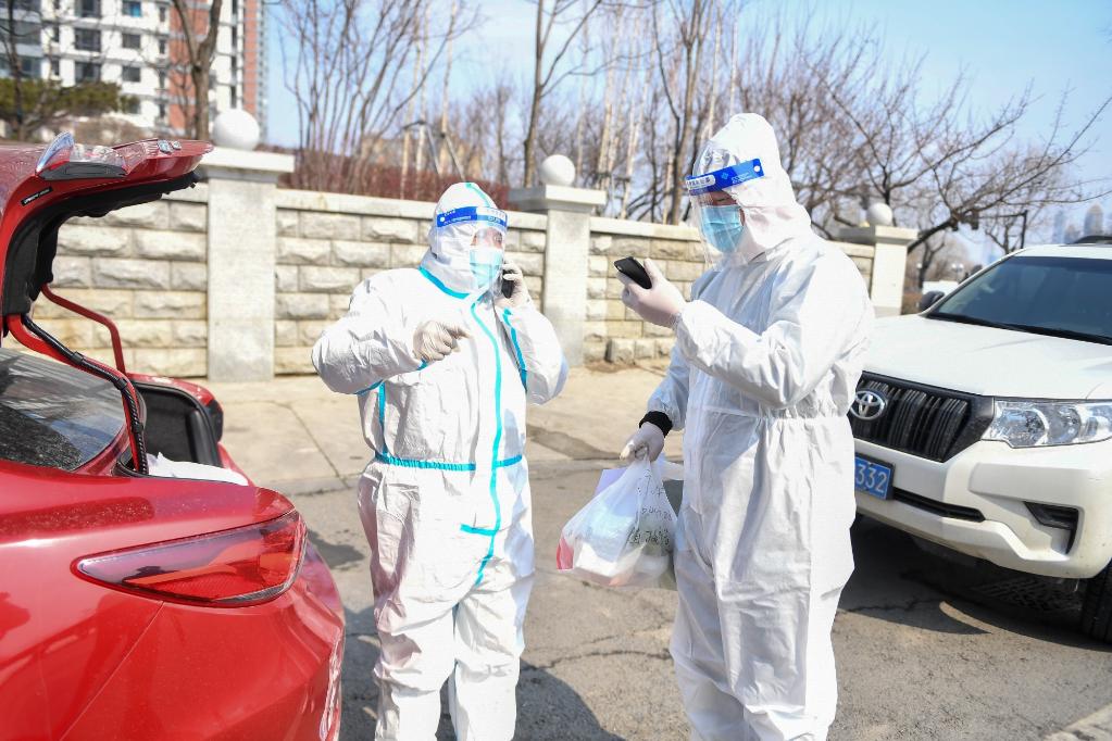3月21日,在吉林市一小區卡口,志愿者張銳(右)、陳斌打電話通知社區工作人員取貨。新華社記者 張楠 攝