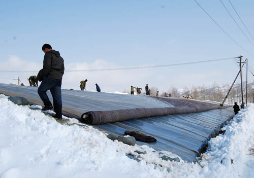 11月12日,群眾組織起來支起被暴雪壓倒的蔬菜大棚。