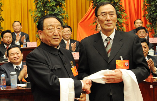 1月15日,新當(dāng)選的西藏自治區(qū)人大常委會(huì)主任向巴平錯(cuò)(右)和原人大常委會(huì)主任列確互敬哈達(dá)。新華社記者格桑達(dá)瓦攝