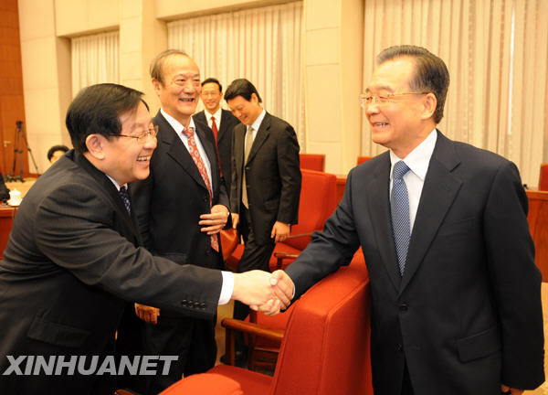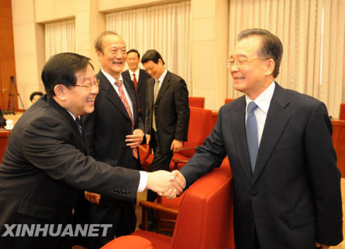 1月29日,溫家寶主持召開座談會,聽取各民主黨派中央、全國工商聯(lián)負(fù)責(zé)人和無黨派人士代表對《政府工作報告》的意見。這是溫家寶與出席座談會的代表握手。1月22日至2月1日,國務(wù)院總理溫家寶在北京中南海主持召開五次座談會,征求對即將提請十一屆全國人大三次會議審議的《政府工作報告》的意見。新華社記者 劉建生 攝