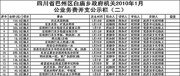 張映上表示,70%的白廟鄉(xiāng)群眾在外打工,因此,賬務(wù)信息首先要讓他們知道。在記者向他提出這一疑問后的第二天,1月份公務(wù)開支明細(xì)已經(jīng)被貼在了鄉(xiāng)政府門口的財務(wù)公示欄上。