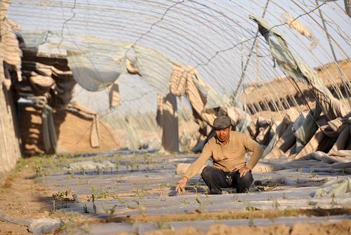 4月24日,恰特卡勒鄉農民提不拉在被大風吹毀的大棚內查看茄苗受損情況。4月23日至24日,新疆吐魯番遭遇大風和沙塵天氣。據吐魯番地委提供的數據,目前42萬多畝農田、1.4萬多座溫室大棚受災,當地還出現因風災導致的火災和建筑物坍塌情況。 新華社記者 江文耀 攝