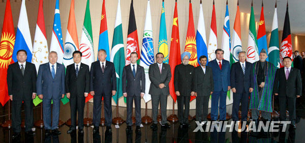 資料圖片 2009年6月16日,上海合作組織成員國(guó)元首理事會(huì)第九次會(huì)議在俄羅斯葉卡捷琳堡舉行,中國(guó)國(guó)家主席胡錦濤與其他成員國(guó)領(lǐng)導(dǎo)人出席。這是上海合作組織成員國(guó)、觀察員國(guó)領(lǐng)導(dǎo)人和主席國(guó)客人集體合影。新華社記者 龐興雷 攝