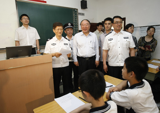 6月10日至11日,國務委員、公安部部長孟建柱在重慶調研。圖為孟建柱來到重慶市求精中學檢查指導校園安保工作。