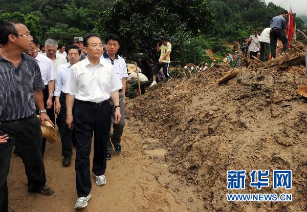 6月19日至20日,中共中央政治局常委、國務院總理溫家寶來到廣西梧州市,實地察看汛情、災情,慰問奮戰在抗洪救災一線的干部群眾,主持召開會議,部署防汛抗洪救災工作。這是6月20日,溫家寶總理冒雨來到大山深處的蒼梧縣沙頭鎮雙尚村杉木坪自然村,察看因山體滑坡、泥石流造成的災情。新華社記者李濤攝