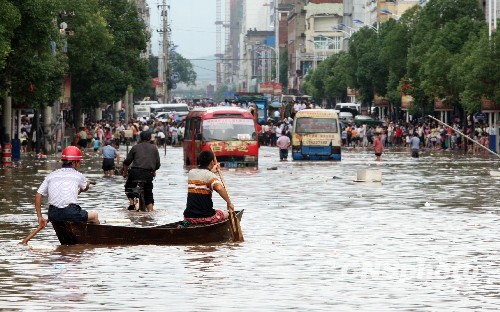 6月20日,江西省東鄉(xiāng)縣遭遇嚴(yán)重洪澇災(zāi)害。自18日20:00至19日17:00時,東鄉(xiāng)縣平均降雨量達(dá)256毫米,居江西省之最,其中6個鄉(xiāng)鎮(zhèn)降雨量都在200毫米以上,王橋鎮(zhèn)最高達(dá)343毫米,東鄉(xiāng)縣主城區(qū)三分之二面積受淹。 中新社發(fā) 朱文標(biāo) 攝