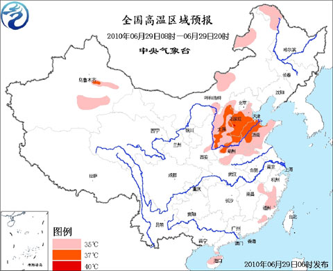 中央氣象臺(tái)29日06時(shí)繼續(xù)發(fā)布高溫藍(lán)色預(yù)警:預(yù)計(jì),今天白天,內(nèi)蒙古東北部和中部的部分地區(qū)、黑龍江西北部、山西大部、河北大部、天津、河南大部、山東大部、安徽北部、江蘇西北部、福建北部和南部的部分地區(qū)、江西東北部的部分地區(qū)、海南北部等地有35~37℃、部分地區(qū)38℃的高溫天氣,其中,河北南部的局部地區(qū)氣溫可達(dá)40℃。