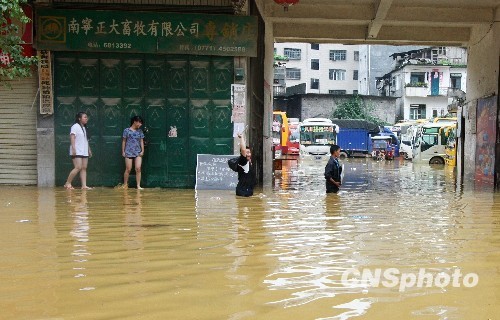 6月28日,廣西鳳山縣消防官兵幫助群眾轉移財產。當日,鳳山縣遭受今年以來最強的暴雨襲擊,全縣9個鄉鎮普降大到暴雨,最大降雨量為中亭鄉204毫米。縣城區部分街道出現內澇,全縣受災人口達5.8943萬人。 中新社發 周恩革 攝