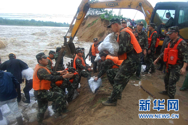 安徽省桐城市大沙河青草段發生崩岸的現場(2010年7月11日攝)。連日來,安徽桐城市遭受歷史罕見的特大暴雨襲擊。11日上午10時,桐城市大沙河青草段發生決堤,武警安慶市支隊110名官兵火速趕赴現場,努力填堵缺口。新華社發(廖福安 攝)