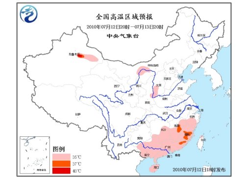 中央氣象臺7月12日18時繼續發布高溫藍色預警:預計,13日白天,內蒙古河套地區、陜西關中東部、山西西南部、湖南中南部、江西中南部和東北部、浙江中南部、福建大部、廣東大部、廣西大部、海南大部、臺灣西北部等地有35℃以上高溫天氣、局地溫度可達37~38℃。