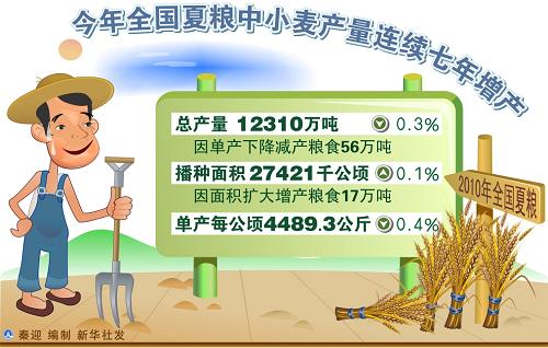 今年以來,中國氣候異常,災害嚴重,農業(yè)發(fā)展面臨巨大壓力。在嚴峻的形勢下,各級農業(yè)部門通過加大農業(yè)生產扶持力度、強化防災減災和科技支撐等措施,實現夏糧播種面積繼續(xù)增加,冬小麥畝產達到321.1公斤,比上年增加0.2公斤,全國11個夏糧主產省(區(qū))均有不同程度增產,小麥優(yōu)質率提高4.3個百分點。