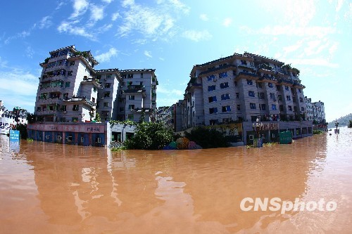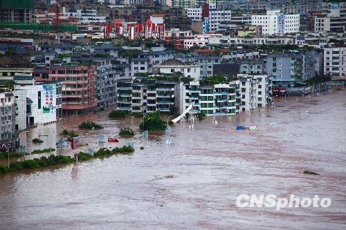 2010年7月19日下午,四川省廣安市的市民在安全地帶觀看160年來最大的洪峰通過廣安城區。四川省渠江上游持續暴雨,導致位于渠江中下游的廣安河段水位陡漲,爆發特大洪水。這次洪水是1847年以來廣安發生的最大洪水。由于抗洪搶險預案科學、及時地啟動,除基礎設施損毀嚴重外,無人員傷亡。 中新社發 邱海鷹 攝