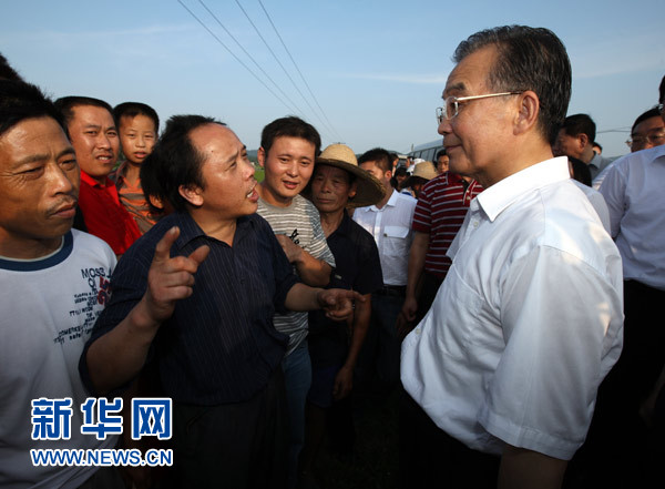 7月1日下午,中共中央政治局常委、國務院總理溫家寶來到湖南考察防汛抗洪工作。圖為陳凱旋擠到總理面前說:“溫總理,我向您反映一個問題。”新華社記者姚大偉攝