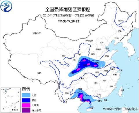 中央氣象臺2010年7月23日06時繼續(xù)發(fā)布暴雨黃色預(yù)警: