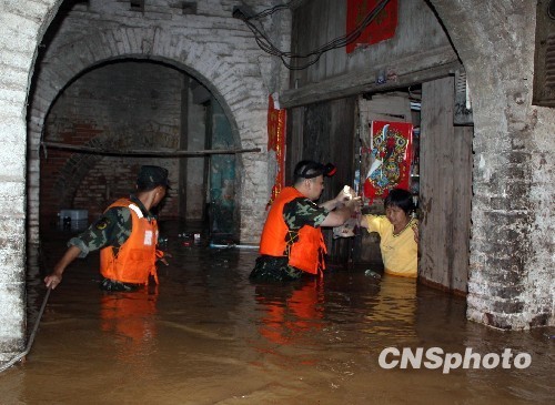 7月24日0點,武警戰士在解救、轉移群眾。7月23日,受臺風“燦都”影響,廣東省化州市北部地區連降特大暴雨,部分江河水位上漲。該市林塵鎮堤壩防洪石墻發生長達35米的決口,鎮上街道水位超過1.5米,羅江左岸林塵鎮以下低洼地村莊2.3萬人受困。當日18時許,武警廣東總隊茂名市支隊緊急派出120余名官兵奔赴災區搶險,成功解救、轉移500多名被困群眾。 中新社發 陸建東 攝