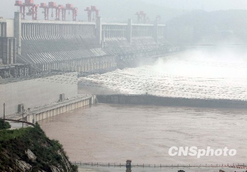 7月27日,湖北宜昌三峽入庫流量每秒51000立方米,葛洲壩下泄每秒42700立方米。據(jù)中國長江三峽集團(tuán)公司26日消息稱,三峽迎來入汛以來的第二輪大洪水,預(yù)計(jì)流量超過50000立方米/秒的洪水將持續(xù)2天左右,28日8時(shí)將達(dá)到最大峰值56000立方米/秒。為應(yīng)對此次洪峰,25日長江防總下達(dá)調(diào)度令,要求三峽水庫于當(dāng)天17時(shí)起按40000立方米/秒控泄以騰出部分... 中新社發(fā) 韓玉洪 攝