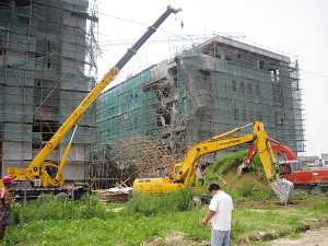 據業內人士介紹,在樓與樓之間建“連廊”(天橋),并不是“高難工程”,泰州開發區建筑工地為何犯了如此“不高級”的錯誤?附近工地一名工作人員介紹,據他所知,“天橋”坍塌可能有兩個原因,一是該“天橋”當天上午澆筑時,在半空中負責提供混凝土的斗車,因操作失控,誤撞了并不牢固的“天橋”;二是在下面支撐“天橋”的腳手架的“力量”不夠。但這兩種解釋并沒有得到有關方面的確認。(陳天斌 王國柱 文/攝)