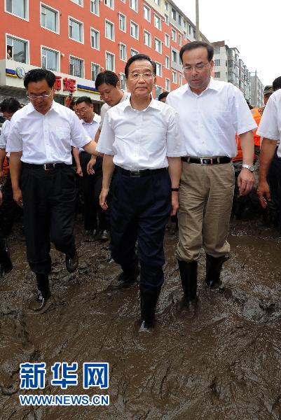 8月3日至4日,中共中央政治局常委、國務院總理溫家寶在吉林省考察防汛抗洪工作。這是8月3日,在吉林市永吉縣城,溫家寶穿著膠鞋,踩著泥濘的道路察看災情。新華社記者 李濤 攝