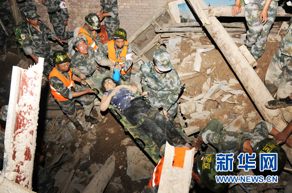 8月8日20時50分左右,蘭州軍區某防化團官兵救出一名幸存者。甘肅舟曲縣特大山洪泥石流災害發生后,蘭州軍區某防化團602名官兵經過6個多小時的急行軍到達災區,隨即展開人員搜救,截至8日20時50分共救出9名幸存者。目前,官兵們仍連夜奮戰在救援一線,爭分奪秒進行生命大營救。新華社發 (張永進 攝)